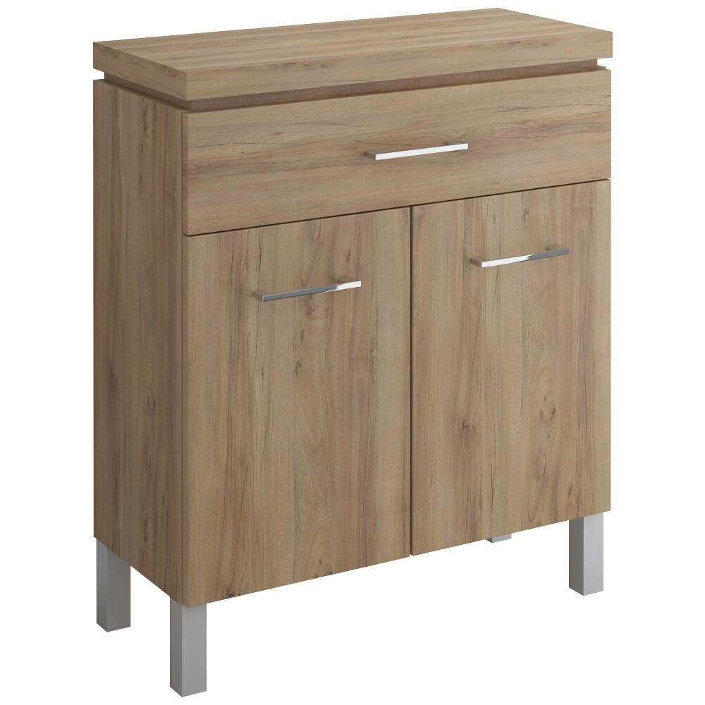 Stojící komoda OLIVIA s vlastní montáží, v ořechovém provedení, doplněna stříbrnými dvoubodovými madly, včetně nožiček.