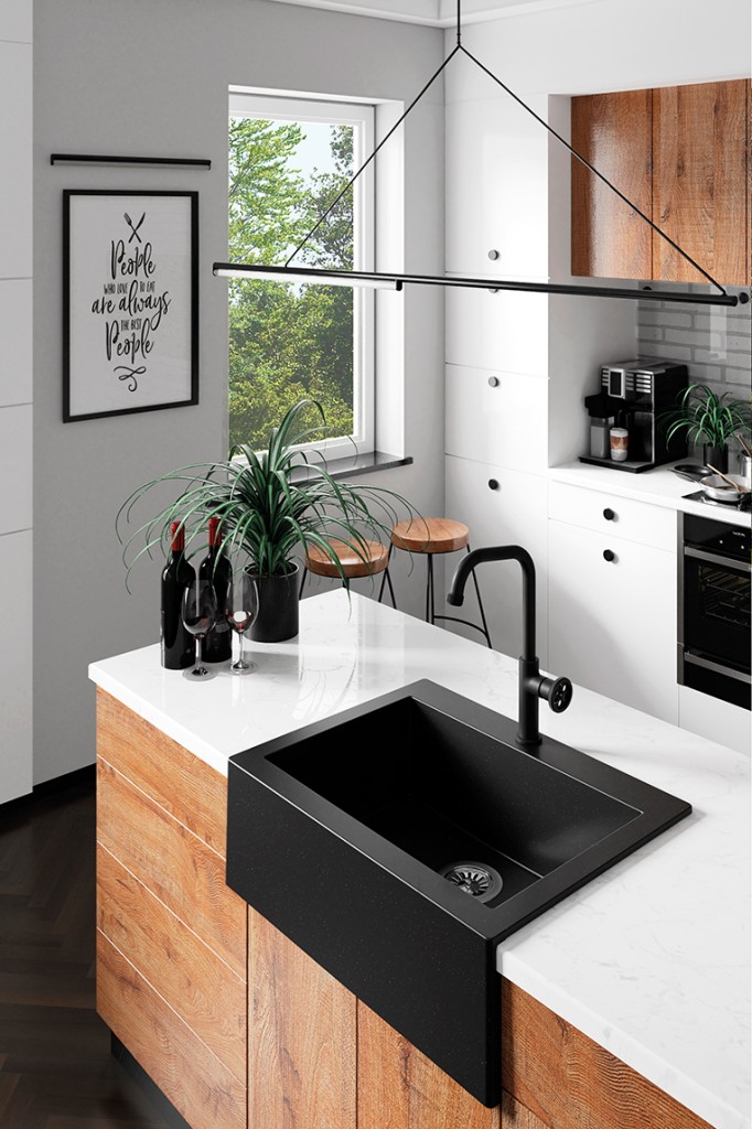 Komodo je unikátní žulový dřez, který se vyznačuje svou jedinečnou, širokou přední částí, viditelnou na pozadí kuchyňského nábytku. Dřez, navržený Marií Kubiak, produktovou manažerkou značky Laveo, je vyroben v Polsku a je jediným žulovým produktem svého druhu na trhu. Unikátní tvar Komoda je ideální pro kuchyně ve skandinávském a provensálském stylu a díky široké škále barev i pro modernější interiéry. Model se vyznačuje velkou, funkční mísou a jeho vyčnívající přední část umožňuje pohybovat se co nejblíže k dřezu a zaujmout pohodlnou polohu šetrnou k zádům během každodenních činností. Komodo se pyšní odolností vůči poškrábání, změně barvy, tepelným šokům a vysokým teplotám (až 250 °C). Spolehlivost žuly také umožňuje, aby byl dřez kryt 10letou zárukou a celostátním servisem. Přední část dřezu, známá také jako „zástěra“, chrání pracovní desku a dvířka skříněk před přímým kontaktem s vodou. Dřez je vybaven sifonem šetřícím místo, který šetří místo ve skříňce a usnadňuje organizaci systémů třídění odpadu. Výrobek je navíc vybaven automatickou zátkou, která usnadňuje otevírání a zavírání odtoku, aniž byste museli ponořovat ruce do vody používané k mytí nádobí.