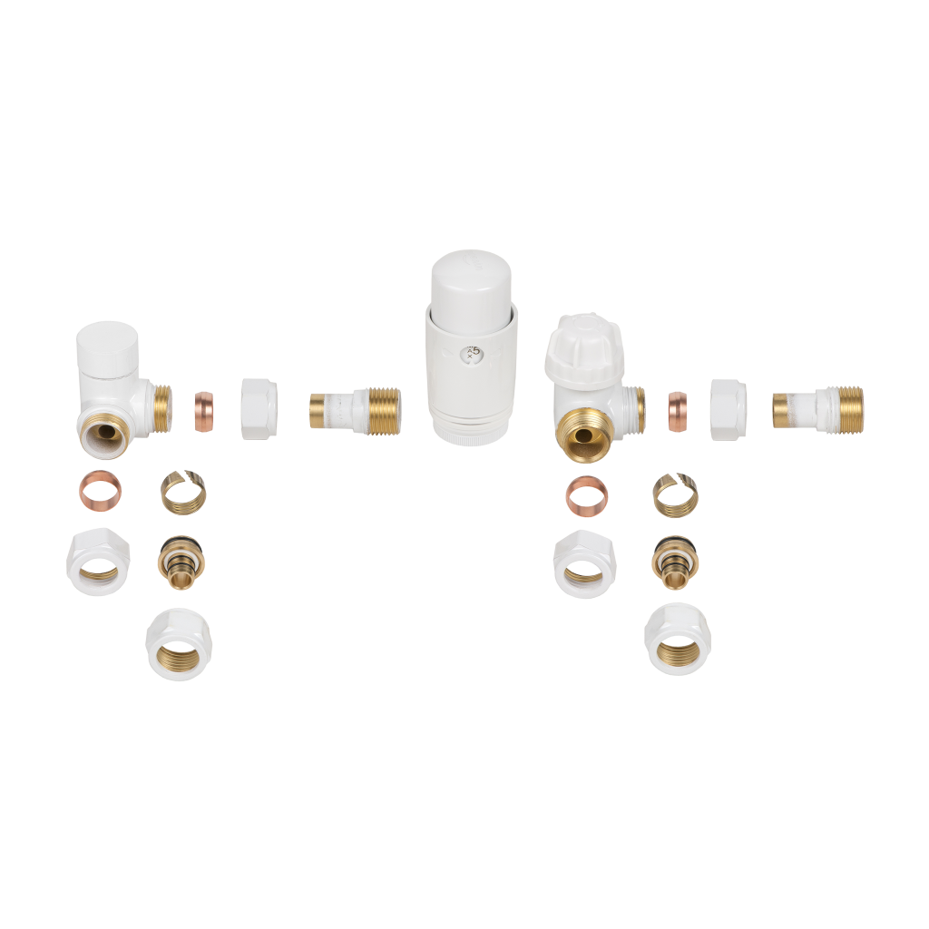 Pro připojení koupelnového radiátoru v měděném nebo PEX systému, levém nebo pravém. Sada obsahuje: - 1/2" spojky radiátorů pro 15mm měděné a 16mm PEX systémy, - termostatickou hlavici M30x1,5, - přívodní a vratný ventil. Pro výměnu stran axiální sady (zleva doprava) odšroubujte vložku ze zpětného a přívodního ventilu, prohoďte strany a zašroubujte ji do těles.