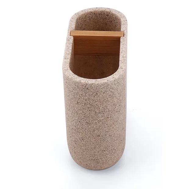 Dóza na kartáčky. Barva pískově béžová. Materiál polyresin, bambusové dřevo.