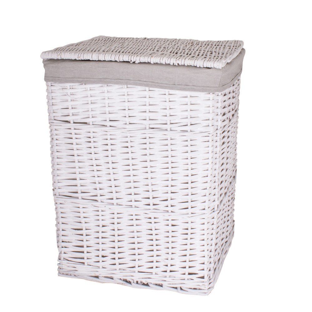 Střední proutěný koš na prádlo. Vnitřek je podšitý bavlněným plátnem. Má kryt připevněný ozdobnými pásky podobnými kůži.