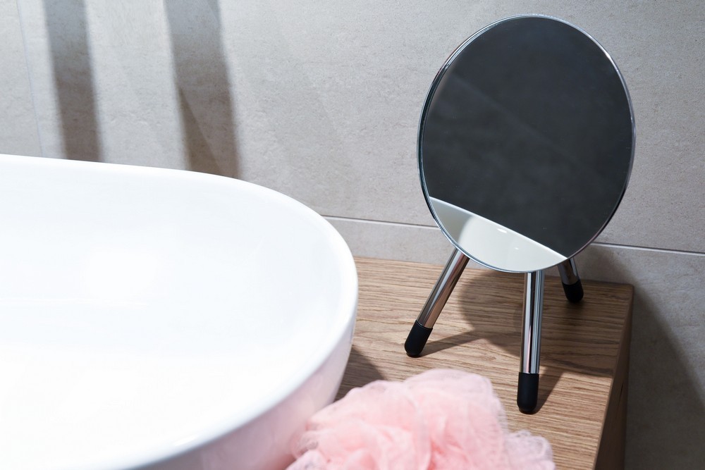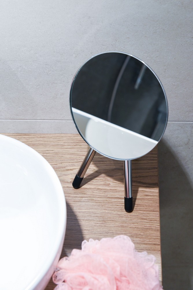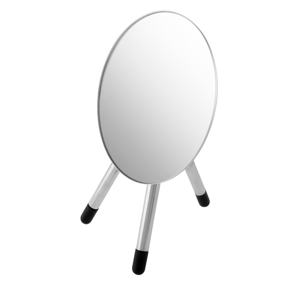 Kosmetické zrcátko z chromované oceli. Střední noha má výškově nastavitelnou funkci.
