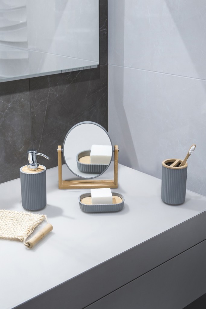 Kosmetické zrcátko ze série RAYON. Zrcátko je oboustranné, jedna strana má dvojnásobné zvětšení obrazu, což výrazně usnadňuje nanášení make-upu a další hygienické činnosti. Zrcadlo má šedý rám. Je upevněna na stojanu z přírodního bambusu, který je módním doplňkem.