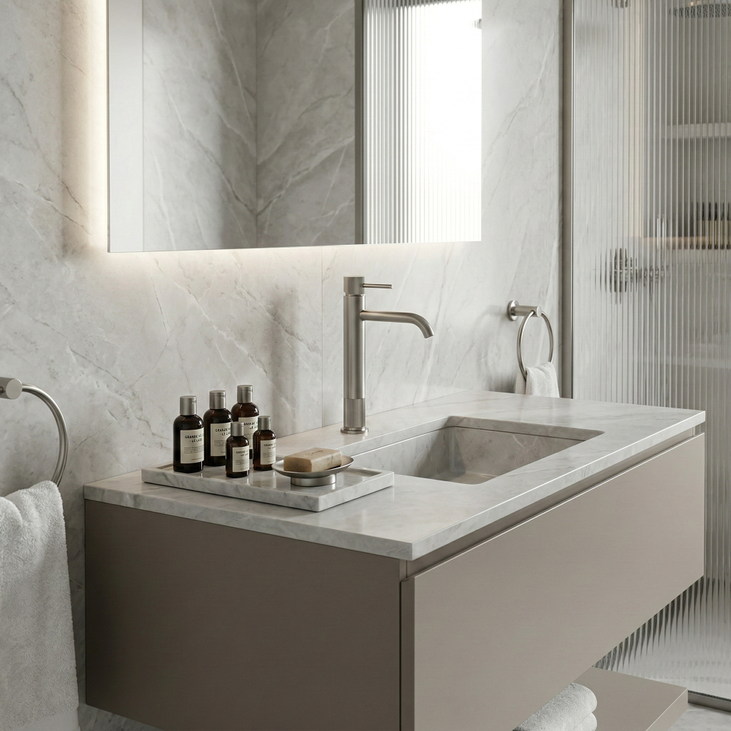 Podtrhněte moderní charakter své koupelny volbou vysoké umyvadlové baterie Rea Lungo Stripe v provedení Nikl Kartáčovaný. Tento štíhlý, vysoký model je navržen pro trendy umyvadla na desku, kde je stejně důležité pohodlí i propracovaná estetika. Válcové tělo v kombinaci s dekorativním rýhováním a jemně zaobleným výtokem vytváří elegantní, kompaktní celek – ideální do minimalistických, loftových i prémiových interiérů.Vysoká konstrukce – prodloužené tělo zajišťuje pohodlné používání a perfektně se hodí k umyvadlům na desku s vyšším okrajem.Povrch Nikl Kartáčovaný – chladný saténový odstín dodává prostoru moderní lehkost a usnadňuje údržbu.Design Stripe – dekorativní svislé rýhování na ovladači a základně přidává výrazný „šperkový“ akcent a odlišuje baterii od klasických modelů.Perlátor – integrovaný perlátor optimalizuje spotřebu vody a vytváří měkký, rovnoměrný proud.Páková baterie – ergonomická páka umožňuje plynulé nastavení teploty i průtoku jednou rukou.Vysoká umyvadlová baterie Rea Lungo Stripe Nikl Kartáčovaný je volbou pro ty, kteří oceňují promyšlené detaily a nadčasovou eleganci v moderním pojetí. Štíhlá silueta v kombinaci s dekorativní rýhovanou texturou z ní dělá výrazný prvek umyvadlové zóny a kartáčovaný nikl se skvěle hodí ke světlému kameni, architektonickému betonu i dřevu.