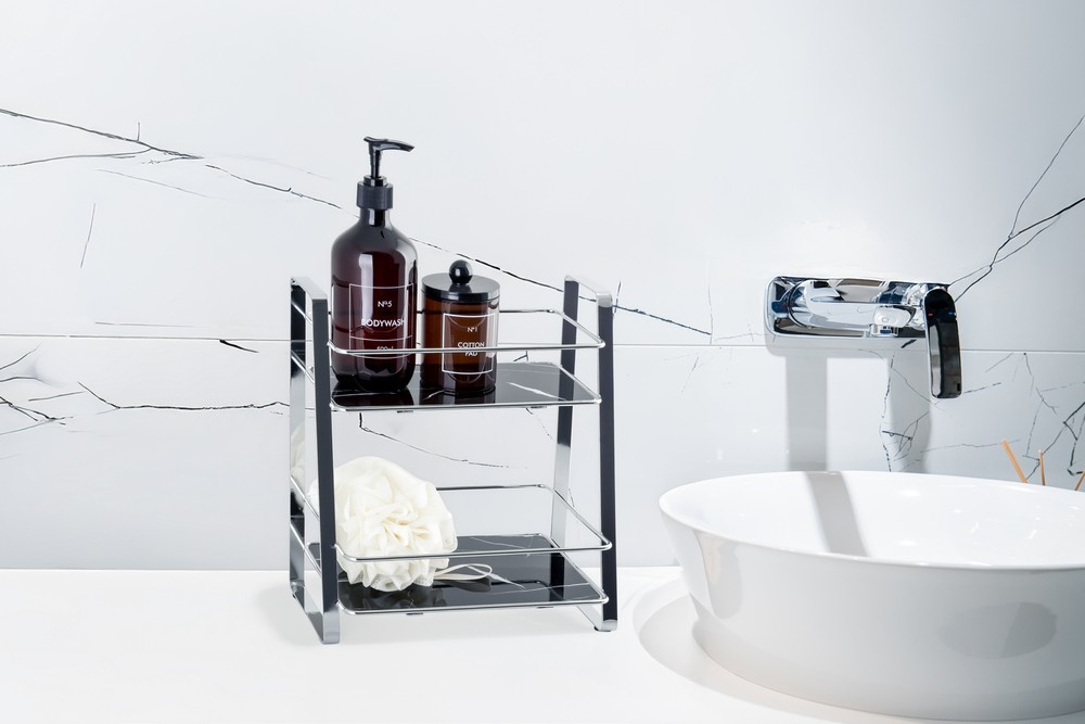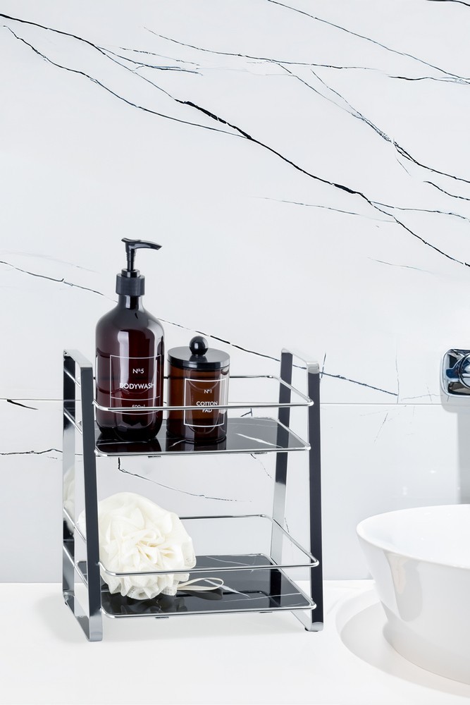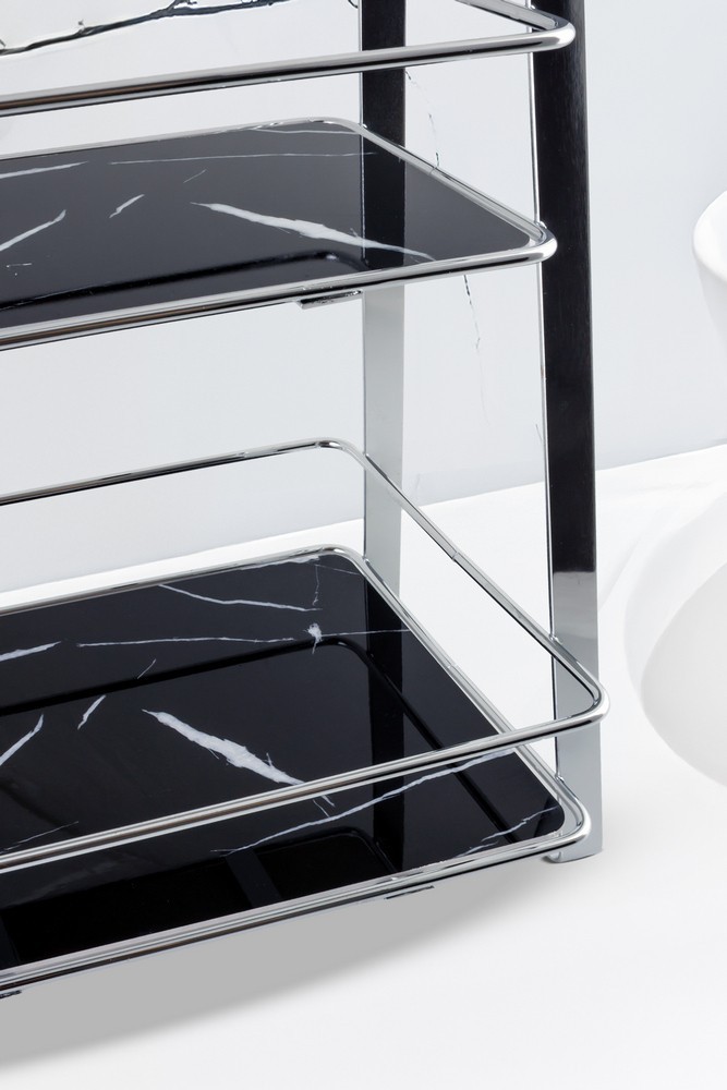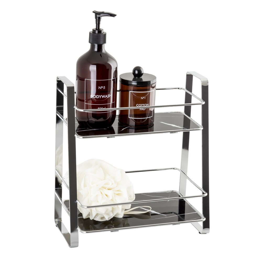 Popis: Elegantní police AWD INTERIOR 2014 je všestranné a stylové úložné řešení, ideální pro koupelny, kuchyně nebo prádelny. Vyrobena z vysoce lesklé chromované oceli s plastovými policemi v černém mramorovém provedení s jemným bílým žilkováním, kombinuje moderní estetiku s praktickou funkčností. Její dvě robustní patra poskytují praktický prostor pro kosmetiku, líčidla a vlasové doplňky a drobné kosmetické potřeby. Díky své konstrukci odolné proti vlhkosti se perfektně hodí do koupelen. Lze ji také použít v kuchyni jako stojan na koření nebo pro uložení nádob a drobných kuchyňských doplňků, čímž dodá každému interiéru pořádek a styl.