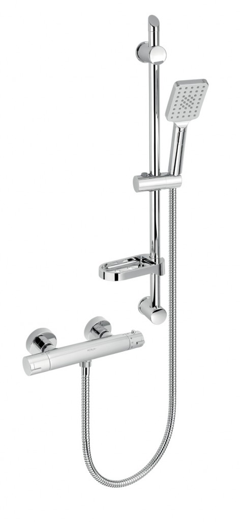 Sprchová nástěnná baterie so spodním vývodem vody s roztečí 150 mm, termostatem na levé rukojeti a ovladačem průtoku na pravé rukojeti a sprchovou tyčí, která nabízí velký rozsah umístění montážních otvorů.