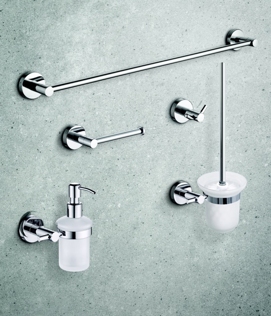 Série ROTE je tvořena dávkovačem mýdla, WC štětkou, háčkem, držákem toaletního papíru a držákem na ručníky.