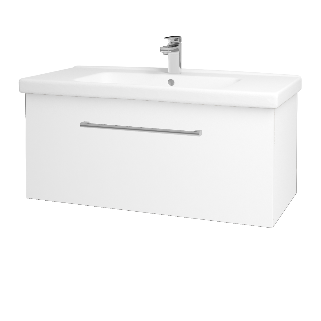 Součástí ceny této koupelnové skříňky je kvalitní keramické umyvadlo Harmonia 100 s hranatým tvarem a pochromovaným odtokem. Vanička umyvadla má v přední části praktické zešikmení. Horní plocha umyvadla je rovná a může sloužit pro odkládání různých předmětů.