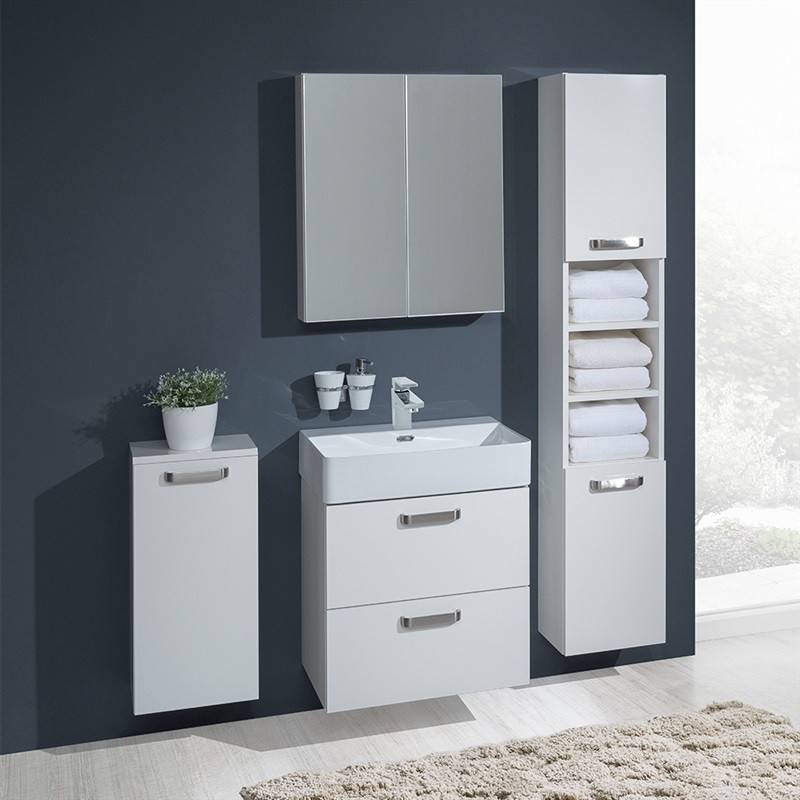 Jednoduchost, efektivnost, elegance. To jsou hlavní společné jmenovatele koupelnového nábytku, který ozdobí každou koupelnu. Tato řada koupelnového nábytku je dodávána pouze v bílé barvě a je vytvořena pro univerzální použití s elegantním a jednoduchým stylem. Umyvadlové skříňky ve dvou šířkách jsou osazeny keramickými umyvadly. Šuplíky jsou vybaveny pojezdy s brzdou pro hladší dovírání. Skříňka je určená k zavěšení a je dodávána ve smontovaném stavu.