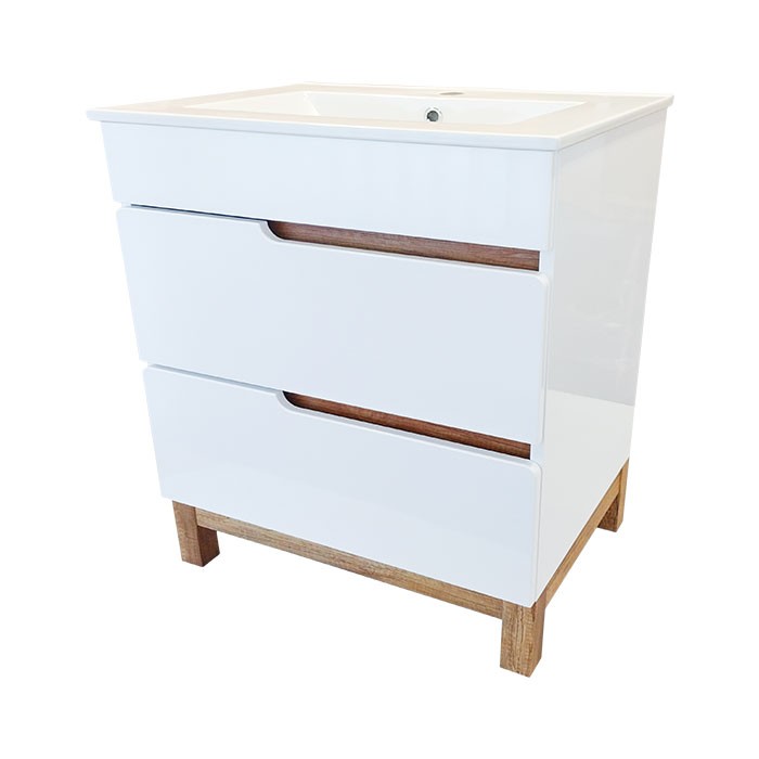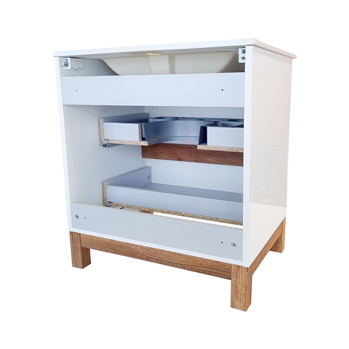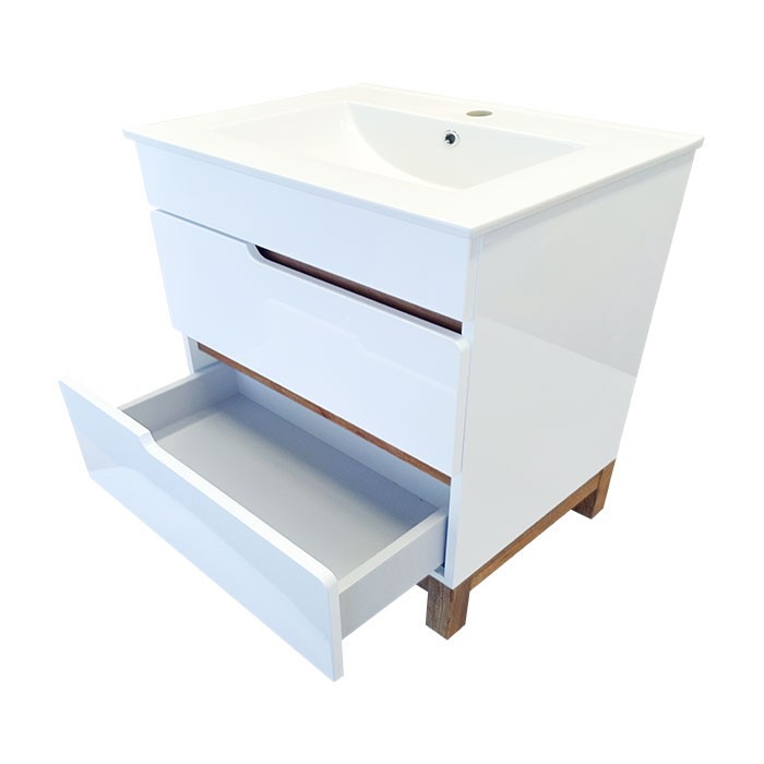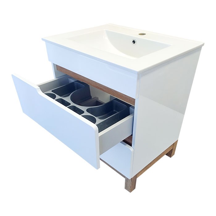 | Popis: | • koupelnová skříňka s keramickým umyvadlem v moderním designu • korpus skříňky z LTD desek s povrchovou úpravou bílým lakem ve vysokém lesu je doplněn dekorativními lištami a nožkami v dekoru Dub Country • čela zásuvek jsou z MDF desky potažené bílou lesklou fólií • součástí skříňky je keramické umyvadlo UM-ASU 80 s přepadem a otvorem pro montáž vodovodní baterie • 2 x zásuvka s tichým dovíráním SoftClose a výřezem pro umyvadlový sifón • v horní zásuvce je umístěn praktický plastový organizér • otevírání je zabezpečeno pomocí frézovaných úchytek |