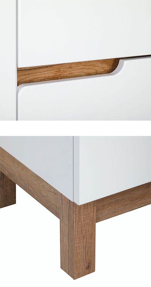 | Materiál: | korpus: LTD 16 mm, bílý lak, vysoký lesk čela: MDF 16 mm, bílá fólie, lesk dekorační lišty: LTD 16 mm, dekor Dub Country nožky: MDF 50 mm, dekor Dub Country |