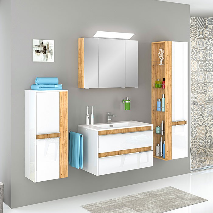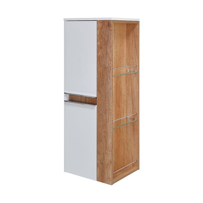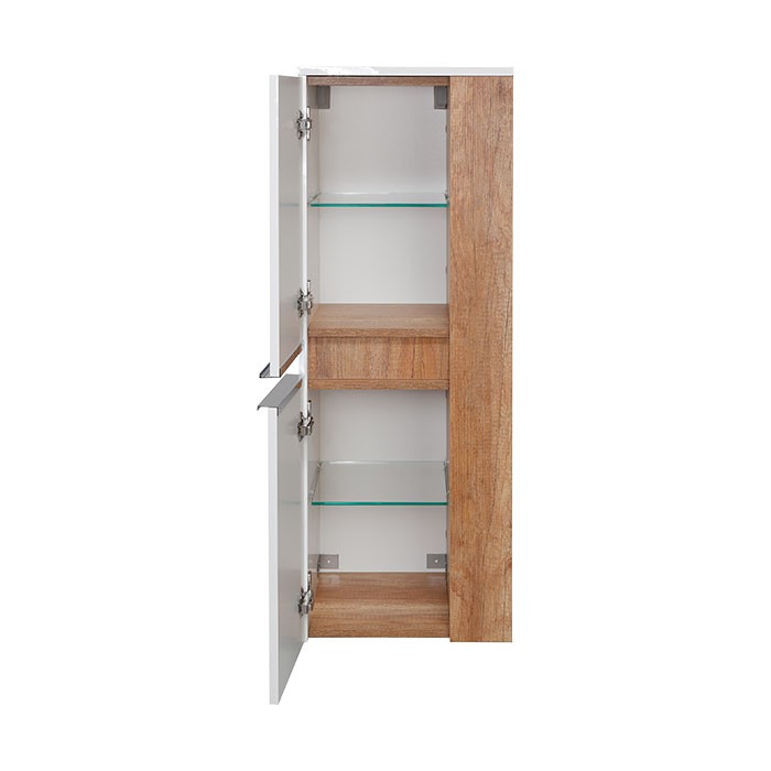 | Popis: | • doplňková koupelnová skříňka nízká v moderní kombinaci bílých lakovaných ploch a dekoru Dub Country • 2 x dířka s tichým dovíráním SoftClose • 2 x skleněná police uvnitř skříňky • 2 x praktická skleněná police s ohrádkou na pravém, nebo levém boku skříňky • možnost změny orientace otevírání dvířek • možnost zavěšení skříňky s vnějšími policemi vpravo, nebo vlevo • kovové, chromované madla |