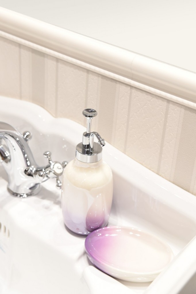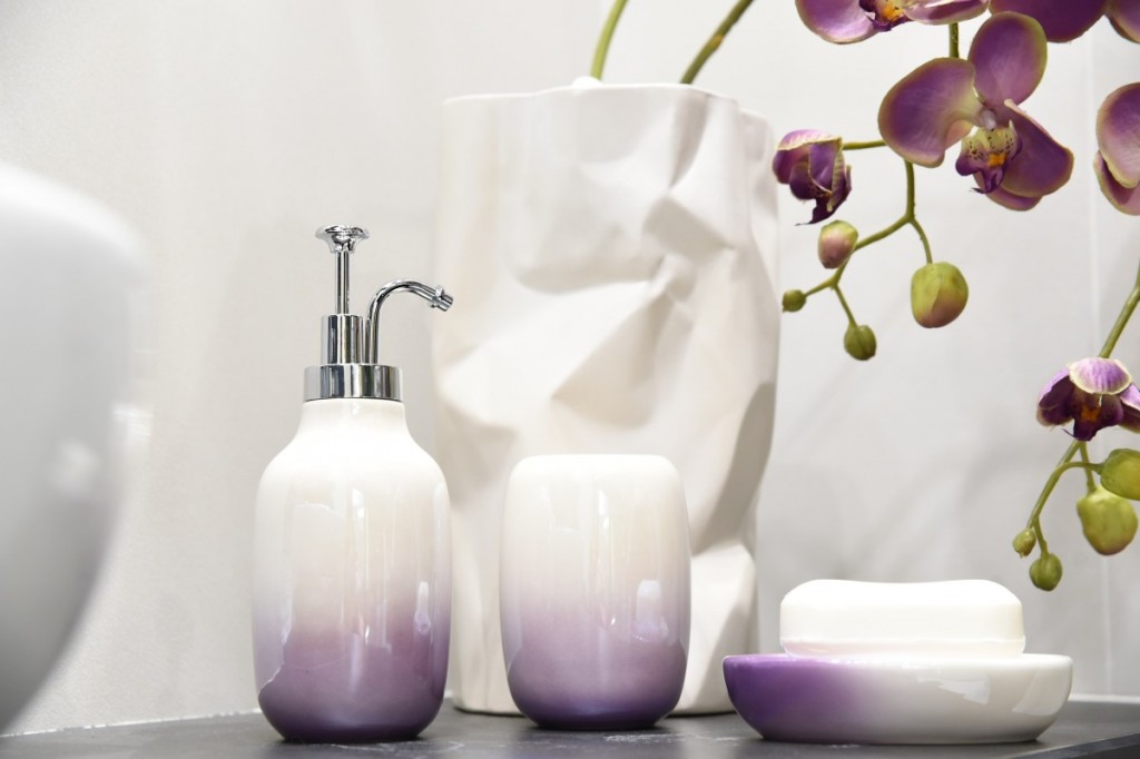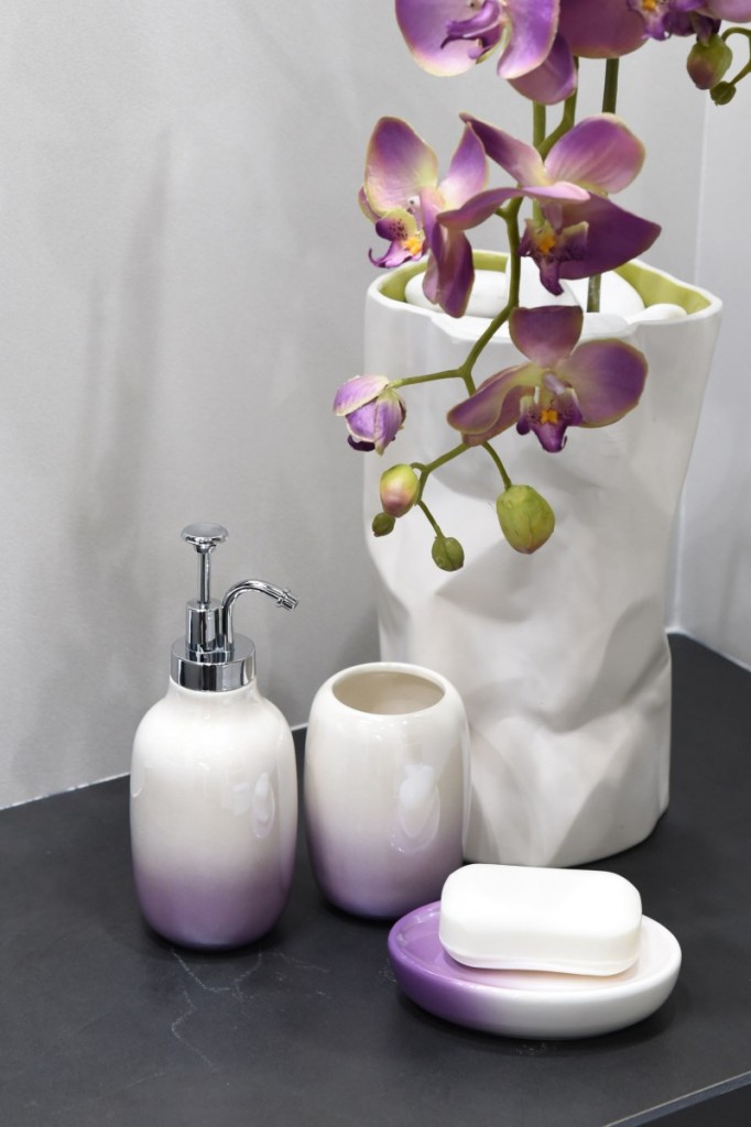 Koupelnový hrnek ze série PREM. Elegantní vzhled podtrhuje jemná kombinace bílé perleťové a fialové.