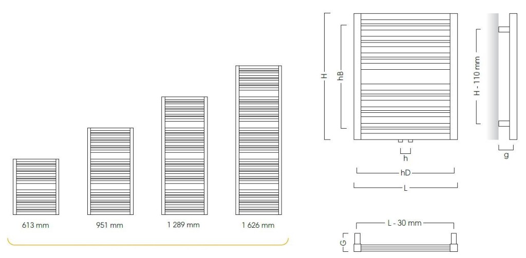 - 400 × 613 mm, výkon 283 W, (topná tyč 300 W) - BOČNÍ PŘIPOJENÍ