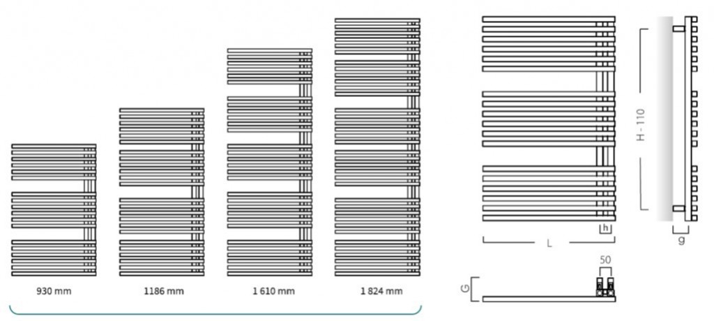 Dostupné rozměry radiátoru GIULIETTA do koupelny:- 400 × 930 mm, výkon 360 W, (topná tyč 300 W)