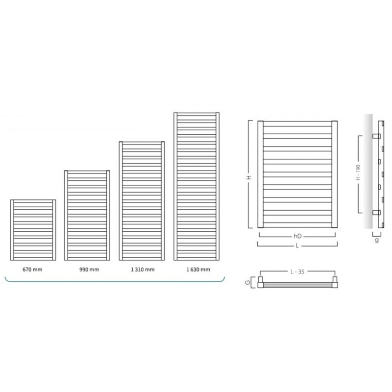 Dostupné rozměry radiátoru POPPY koupelny:- 400 × 670 mm, výkon 261 W, (topná tyč 300 W)