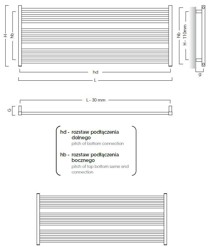 - Spodní: 770 mm, 970 mm, 1170 mm, 1370 mm, 1570 mm, 1770 mm (na spodních stranách radiátoru)