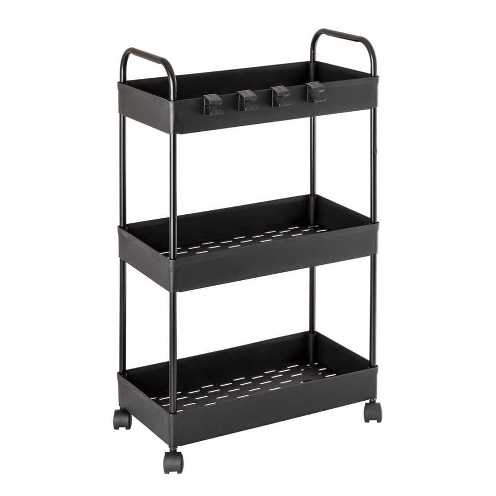 Černá police vyrobená z odolného plastu je všestranným řešením, které dobře funguje v každé místnosti. Jeho robustní kovový rám poskytuje stabilitu a odolnost, zatímco namontovaná kola zajišťují mobilitu, takže se v případě potřeby snadno přemístí. Polička, vybavená třemi košíky, umožňuje efektivní ukládání a organizaci předmětů v koupelně, kuchyni nebo jiných prostorách. Navíc čtyři praktické háčky, které lze připevnit a přemístit na police podle potřeby, nabízejí flexibilní přizpůsobení tak, aby vyhovovaly individuálním požadavkům. Polička se výjimečně snadno montuje a nevyžaduje žádné nástroje – jednoduše postupujte podle přiloženého návodu.