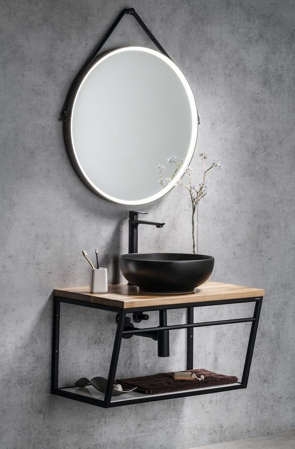 SAPHO - ORBITER kulaté zrcadlo s LED osvětlením ø 70cm, kožený pásek, černá mat (ORL070)