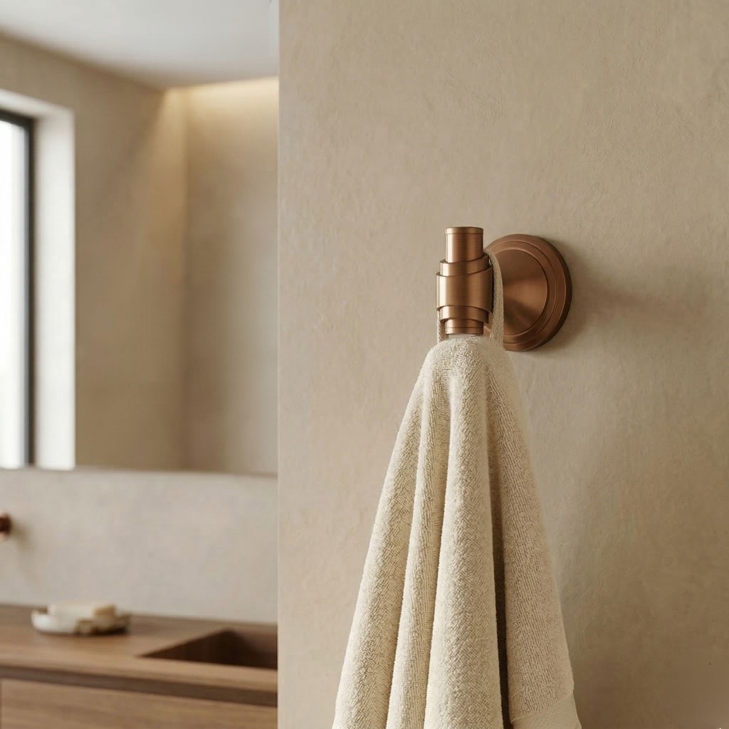 Praktický a elegantní koupelnový věšák v barvě kartáčované mědi je funkčním prvkem vybavení, který se hodí jak do moderních, tak i klasických interiérů. Vyroben je z vysoce kvalitní oceli, což zaručuje odolnost vůči vlhkosti, korozi a každodennímu používání. Minimalistický tvar s klasickým zakončením na konci zajišťuje pevné držení ručníků, županů nebo doplňků a zároveň dodává celku moderní charakter. Nástěnná montáž šetří místo a pomáhá udržovat pořádek v koupelně.