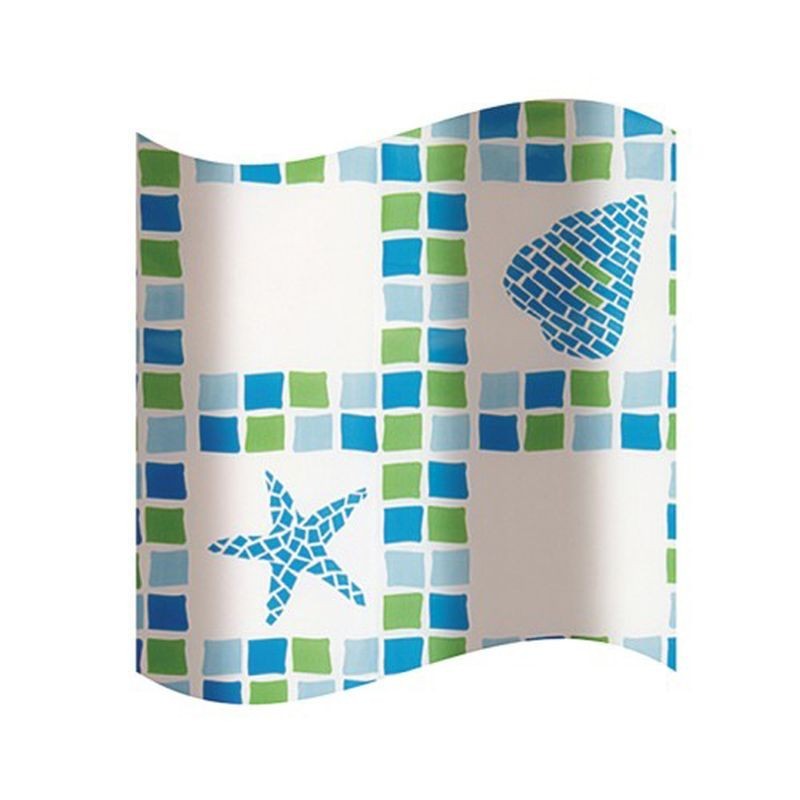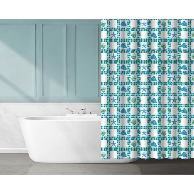 Úžasně praktické a jednoduché řešení, nahrazující sprchový kout, vanovou zástěnu nebo sprchové dveře. Koupelnový plastový sprchový závěs, je vytvořen z recyklovaného PEVA materiálu, který se vyznačuje šetrností k přírodě. Snadná instalace pomocí zavěšovacích kroužků, které jsou součástí balení. Bílý podklad s modrými a zelenými vzory, tvořící mozaiku, obohatí vaši koupelnu.
