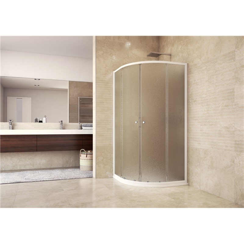 Tloušťka bezpečnostního skla je 4 mm. Sprchový kout je osazen posuvnými dveřmi, které mají ložiskové pojezdy s excentrickým usazením (možnost perfektního seřízení). Dorazy zajišťují minimální nárazy při otevírání a zavírání sprchového koutu.