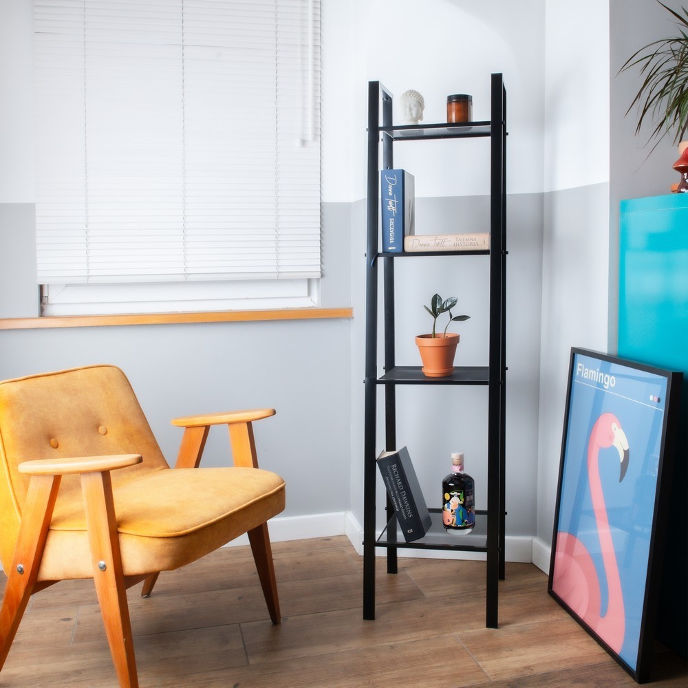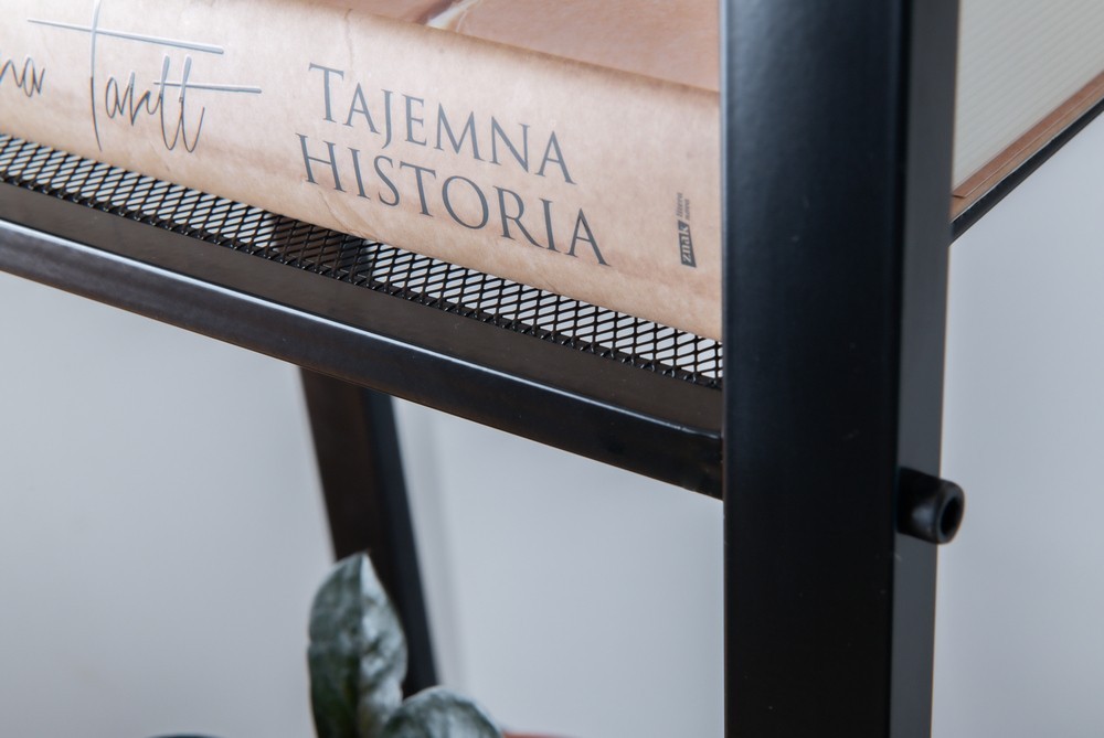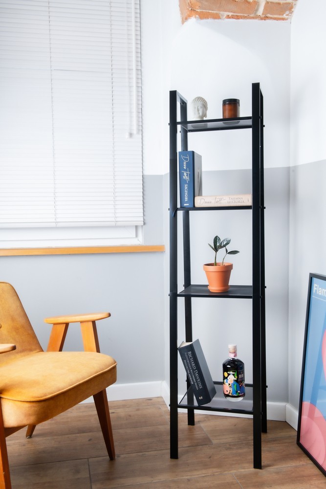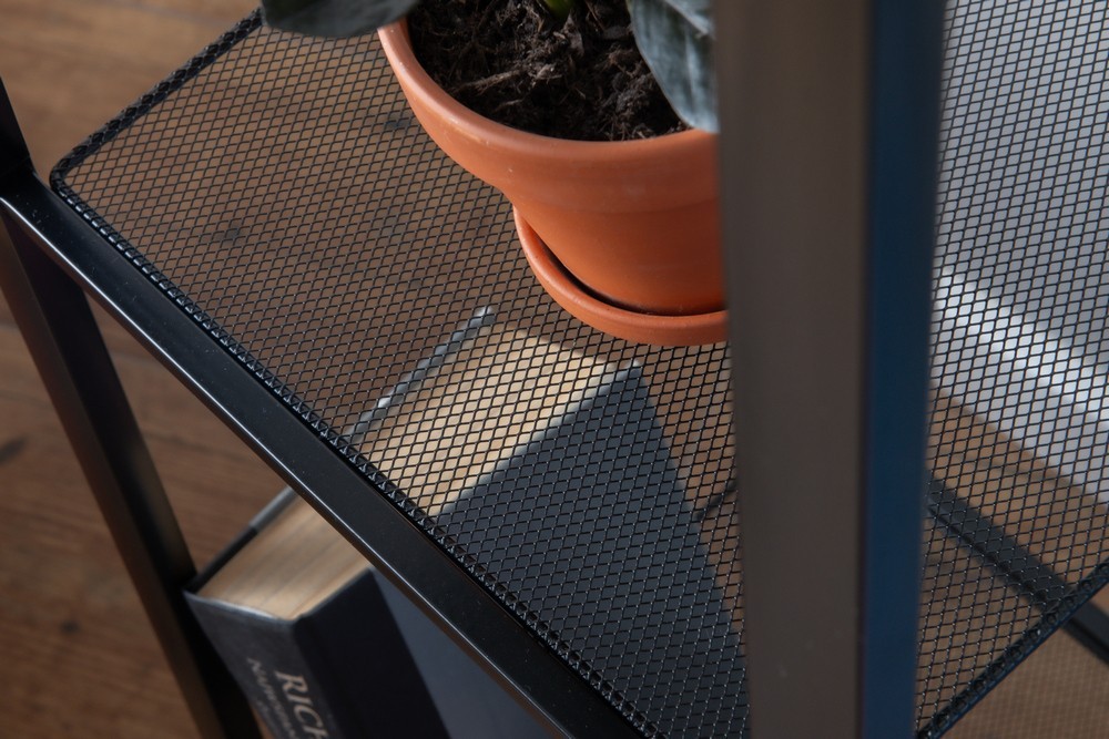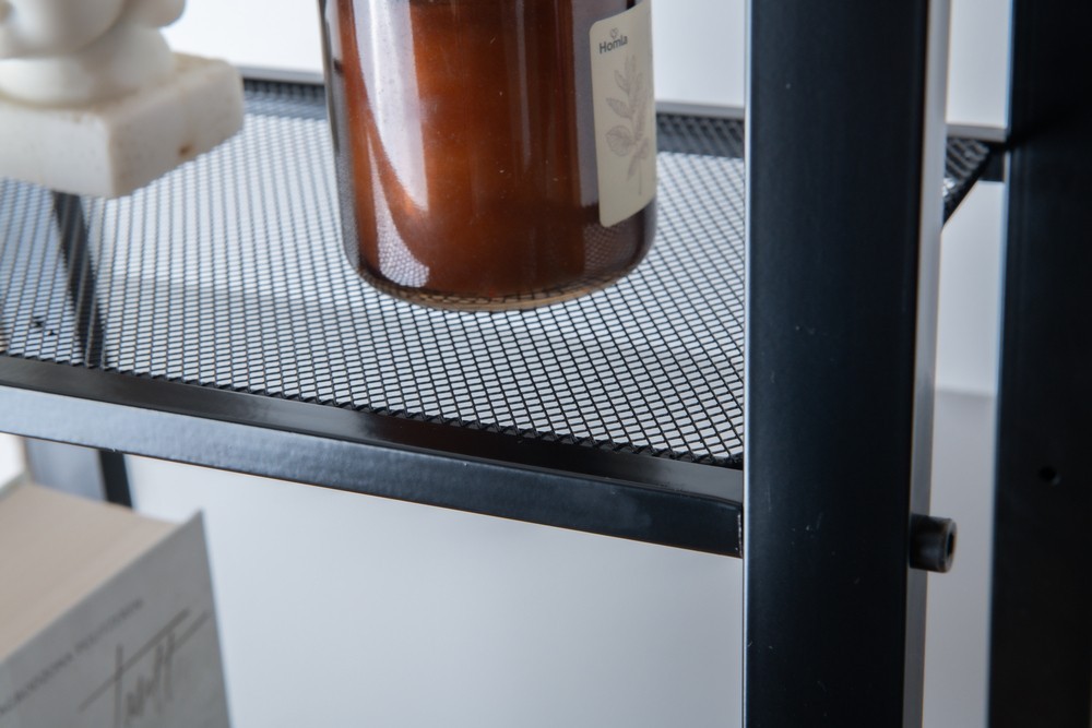 Úzká police se čtyřmi policemi z prolamované síťoviny. Je vyrobena z černě lakované oceli. Bude ideálním řešením pro uložení a vystavení různých předmětů v koupelně, obývacím pokoji nebo na jakémkoli jiném místě ve vaší domácnosti. Tato úzká police nabízí velkou kapacitu a pevnou konstrukci zaručující nejen funkčnost, ale i estetický vzhled. Vyžaduje vlastní montáž.