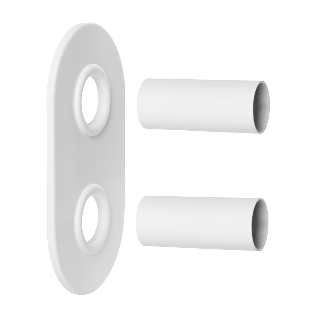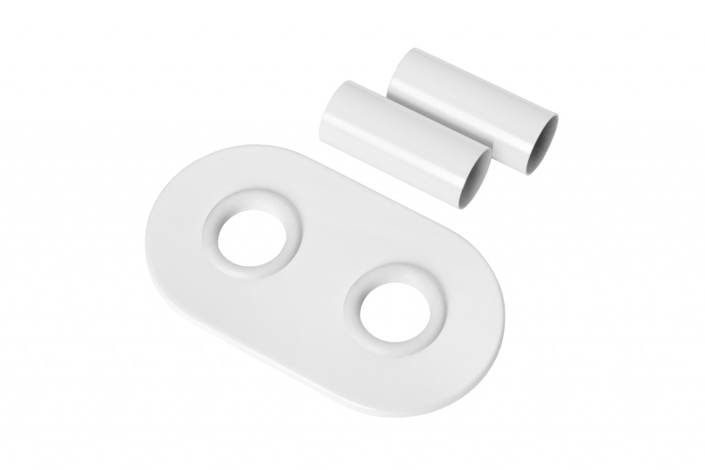 Set krycí dvojité oválné rozety s dvěma otvory a objímkami na radiátor je sada, která se používá k zakrytí spojů mezi radiátorem a přívodním potrubím, čímž zajišťuje estetický vzhled a bezpečné upevnění radiátoru. Sada je v barevném bílém provedejní.