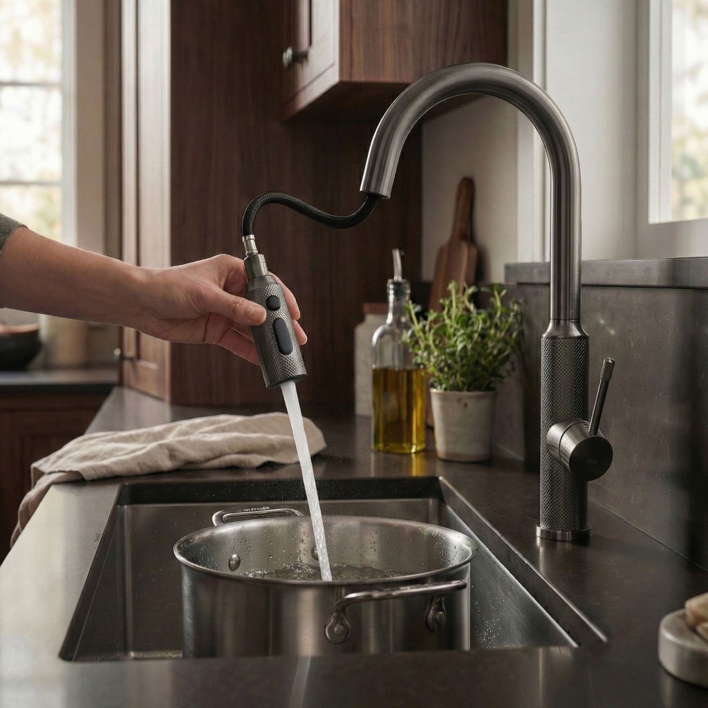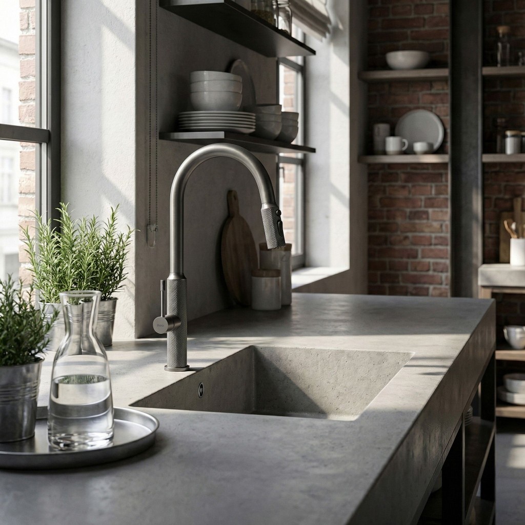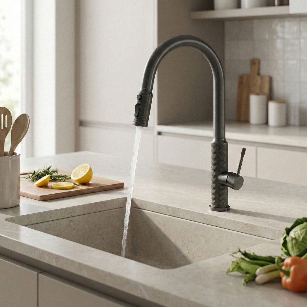 Zmodernizujte zónu mytí nádobí s kuchyňskou baterií Rea Master. Tento model spojuje surový, technický design s vysokou ergonomií práce. Pevné mosazné tělo je zakončeno grafitovým odstínem, díky čemuž jde o odolné řešení pro moderní kuchyně.Povrch Titanium – baterie má efektní tmavě šedou barvu s kartáčovanou strukturou. Titanový odstín je skvělou alternativou ke klasické černé či chromu a dodává interiéru hloubku a moderní charakter.Technologie PVD – povrchová úprava byla nanesena metodou PVD, což zaručuje mimořádnou tvrdost a odolnost proti poškrábání i zmatnění, i při intenzivním používání.Výsuvná výtoková hubice – flexibilní hadice s pohyblivou hubicí výrazně zvyšuje dosah proudu. Usnadňuje mytí nestandardních nádob, důkladné oplachování dřezu i napouštění hrnců na pracovní desce.Dva režimy proudu – přepínač na hubici umožňuje rychlou změnu režimu: z koncentrovaného souvislého proudu na rozptýlený sprchový proud, ideální při mytí zeleniny.Rýhované akcenty – ovládací páka i koncovka hubice mají hmatatelnou diamantovou texturu. Zvyšuje to industriální vzhled a zabraňuje klouzání mokré ruky při ovládání.Baterie Rea Master Titanium je volbou pro ty, kteří ocení profesionální řešení i doma. Titanová barva a technické detaily perfektně ladí s loftovými a minimalistickými interiéry.