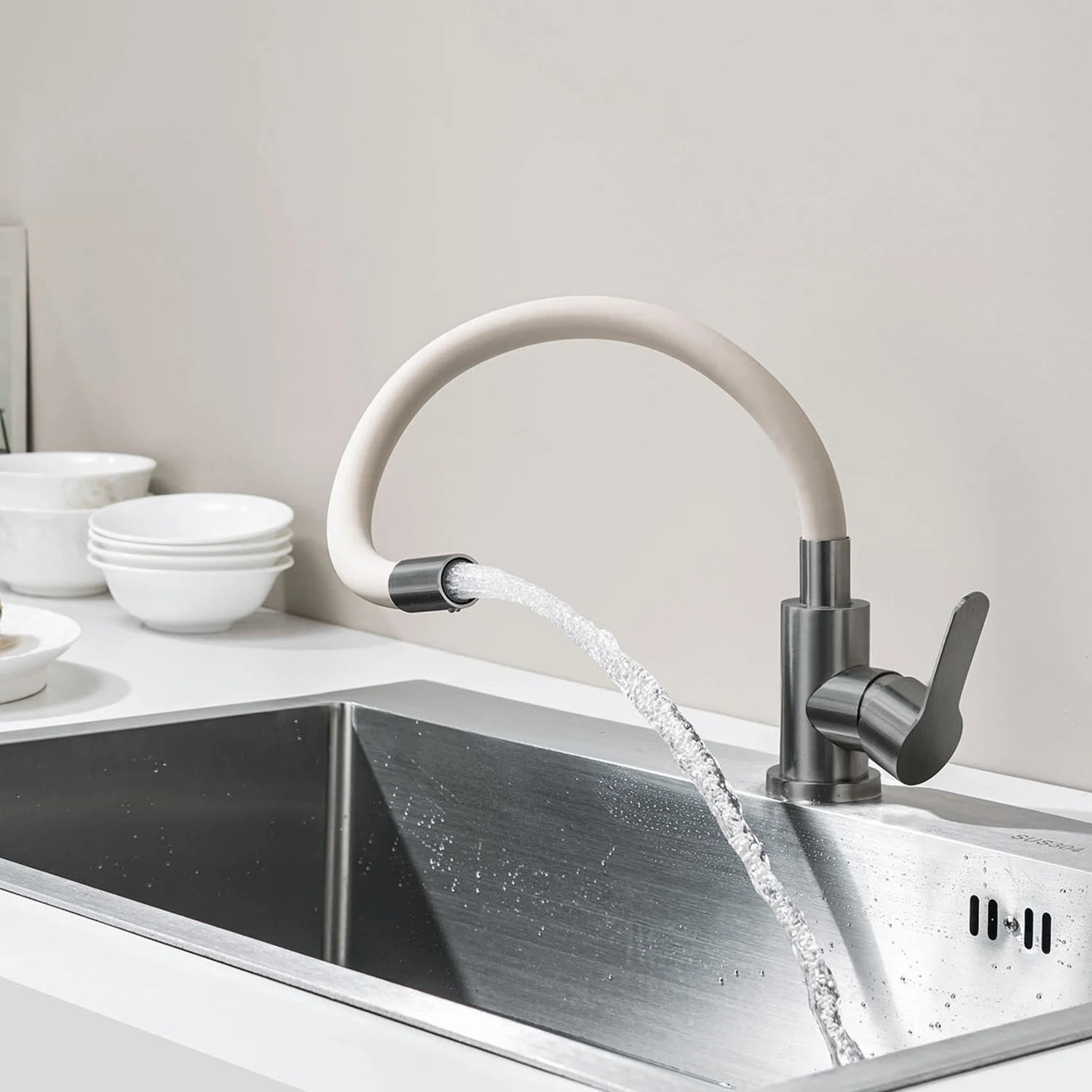Moderní stojánková kuchyňská baterie s flexibilním výtokem nabízí kombinaci stylového designu a praktičnosti. Díky silikonovému výtoku, který lze snadno natáčet, poskytuje skvělý komfort při každodenním používání.