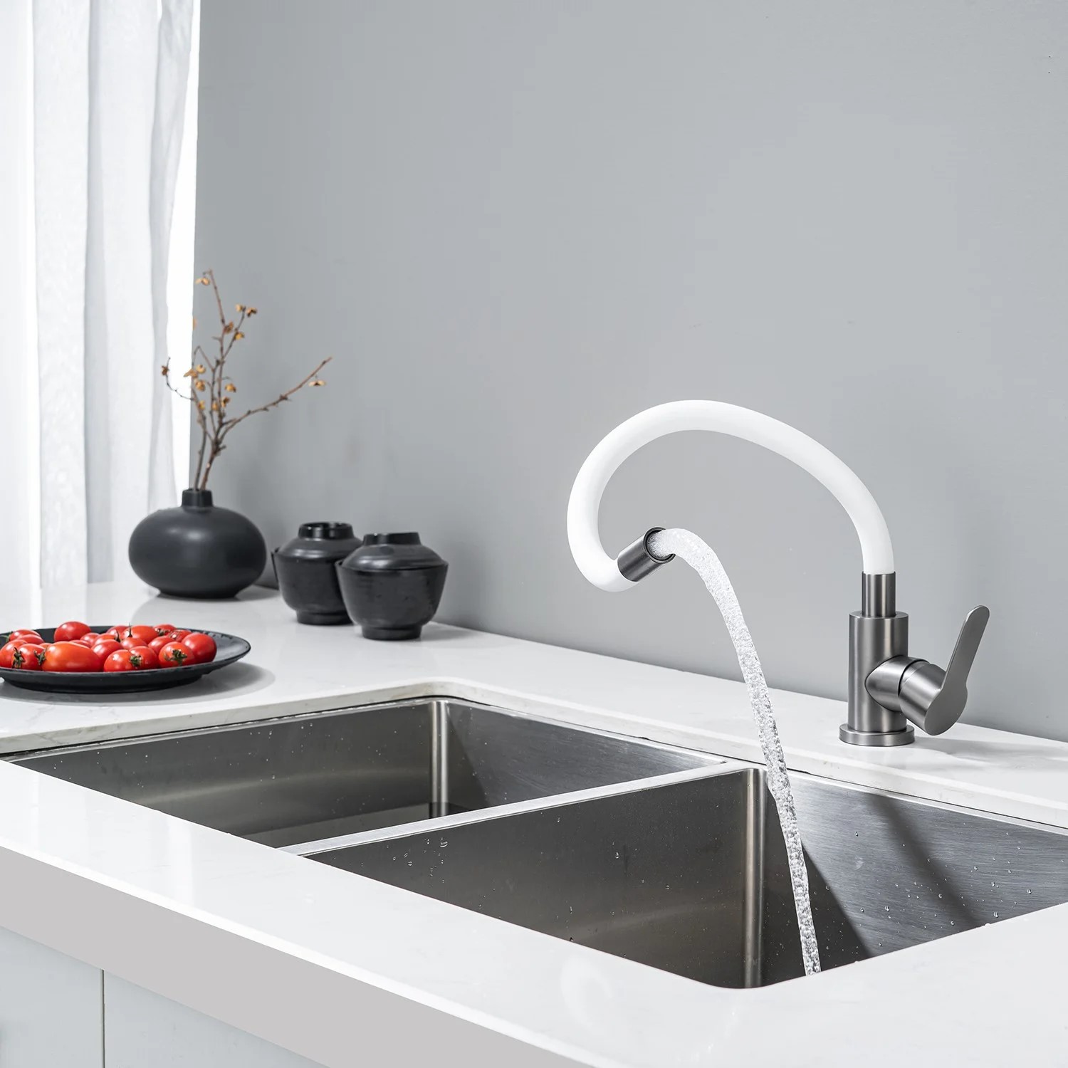 Moderní stojánková kuchyňská baterie s flexibilním výtokem nabízí kombinaci stylového designu a praktičnosti. Díky silikonovému výtoku, který lze snadno natáčet, poskytuje skvělý komfort při každodenním používání.