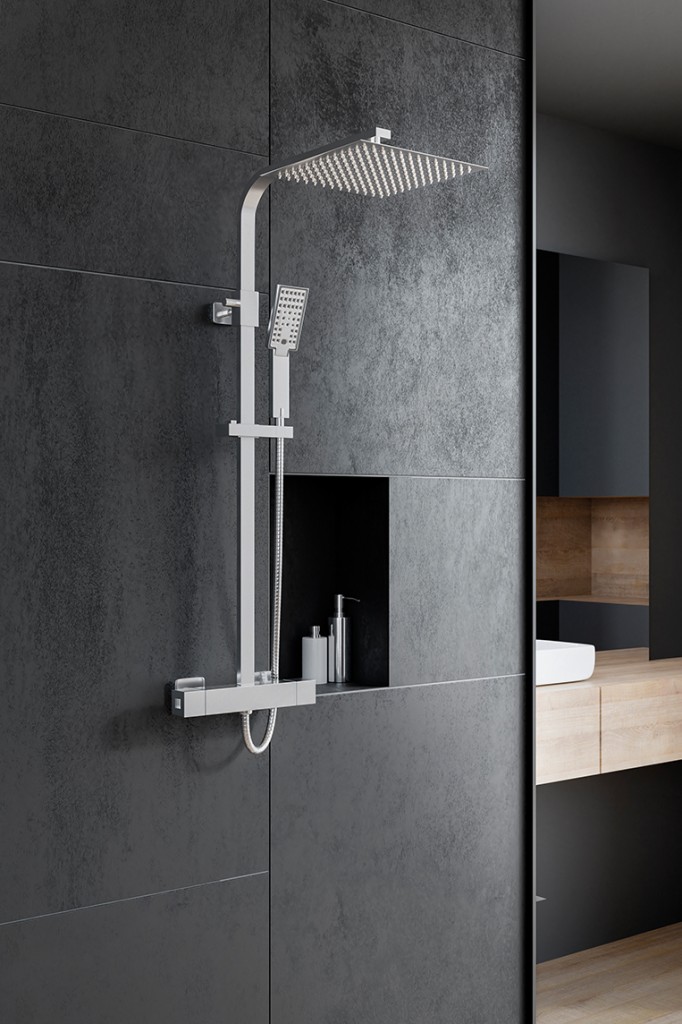 Sprchový sloup série Kvadrato je moderním řešením pro komfortní sprchování, které kombinuje elegantní design s vysokou funkčností. Díky termostatické baterii zajišťuje stálou teplotu vody, čímž zabraňuje nepříjemným teplotním výkyvům. Tím poskytuje bezpečí i pohodlí při každodenním používání.