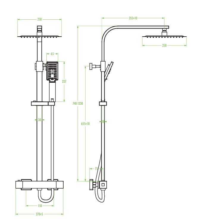 Součástí setu je výškově nastavitelný sloup v rozmezí 740–1230 mm, což umožňuje přizpůsobení různým uživatelům. Dále je vybaven praktickou ruční sprchou s rozměry 246 × 65 mm a dlouhou sprchovou hadicí (1500 mm) pro maximální volnost pohybu.