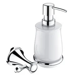 Dávkovač tekutého mýdla. Nádobka keramická 300 ml. Úchyt mosaz. Pumpička plast. Chrome surface.