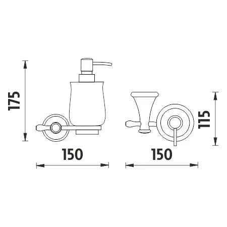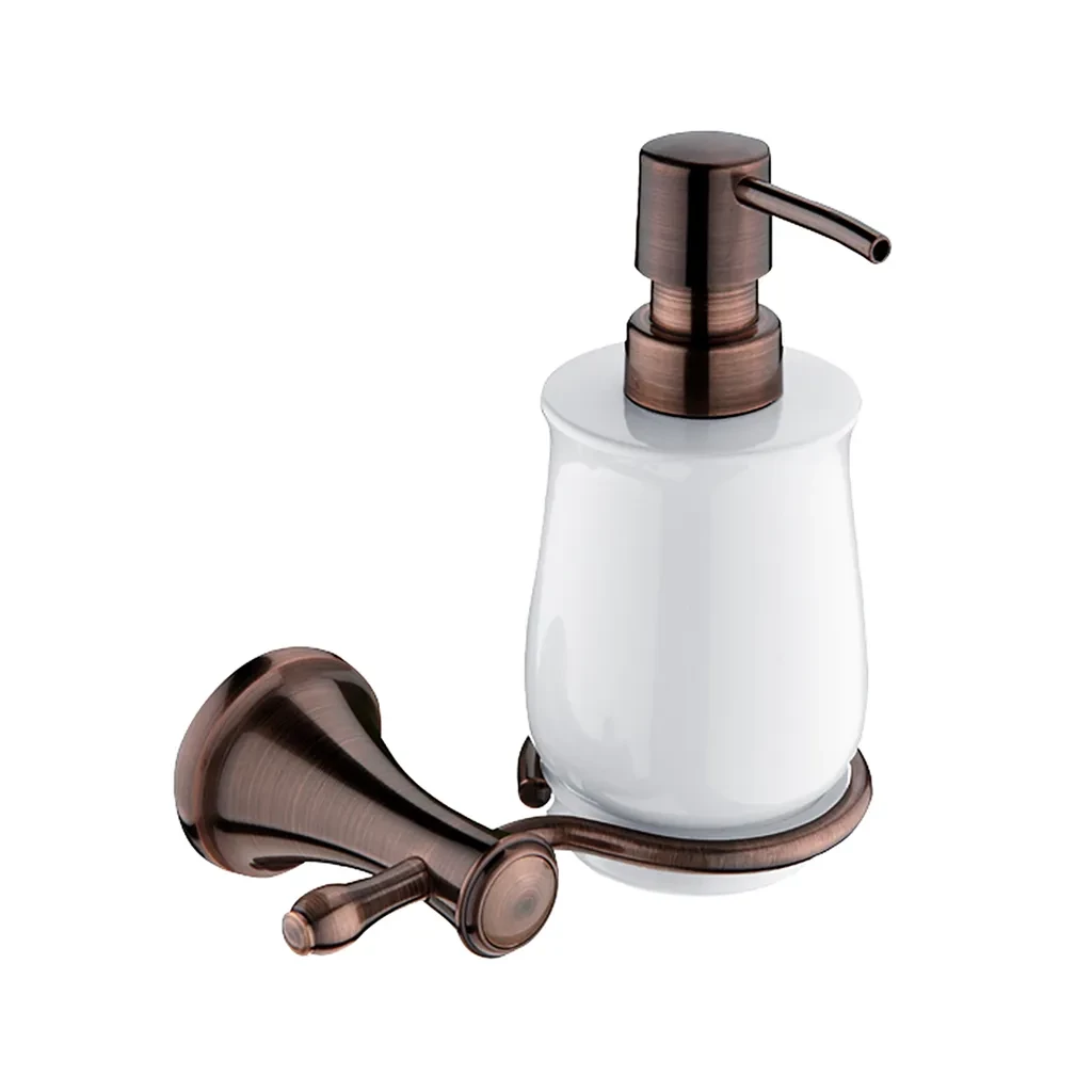 Dávkovač tekutého mýdla. Nádobka keramická 300 ml. Úchyt mosaz. Pumpička plast. Povrch staroměď.