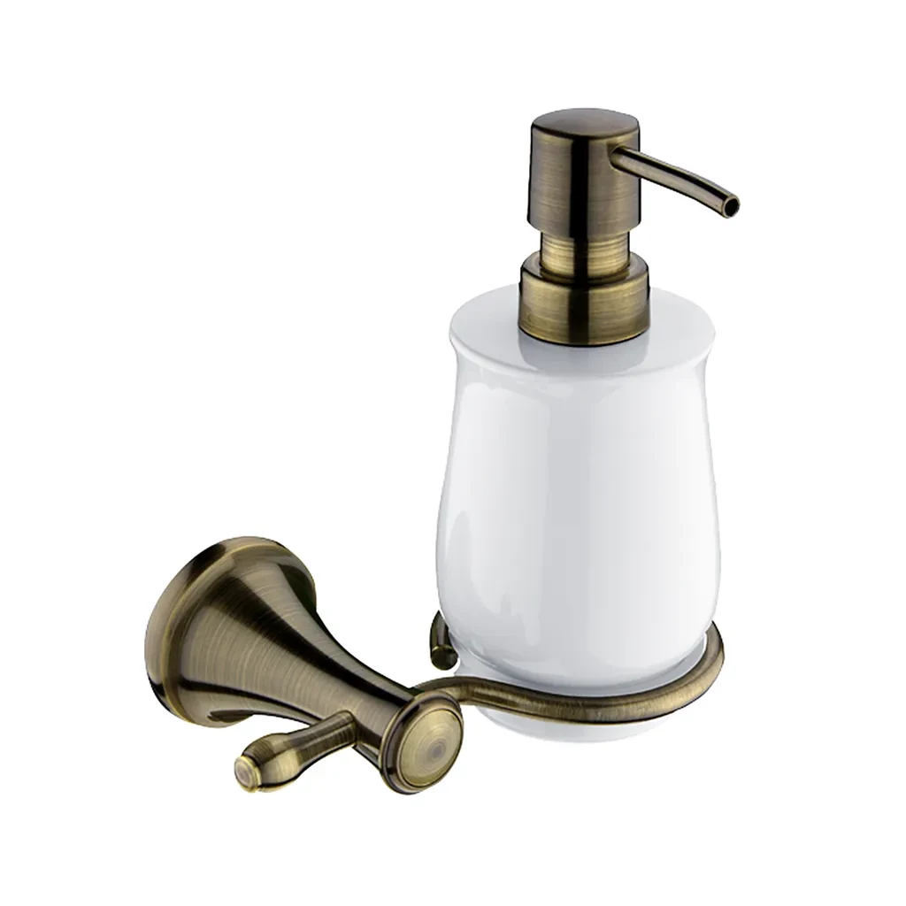 Dávkovač tekutého mýdla. Nádobka keramická 300 ml. Úchyt mosaz. Pumpička plast. Povrch staromosaz.