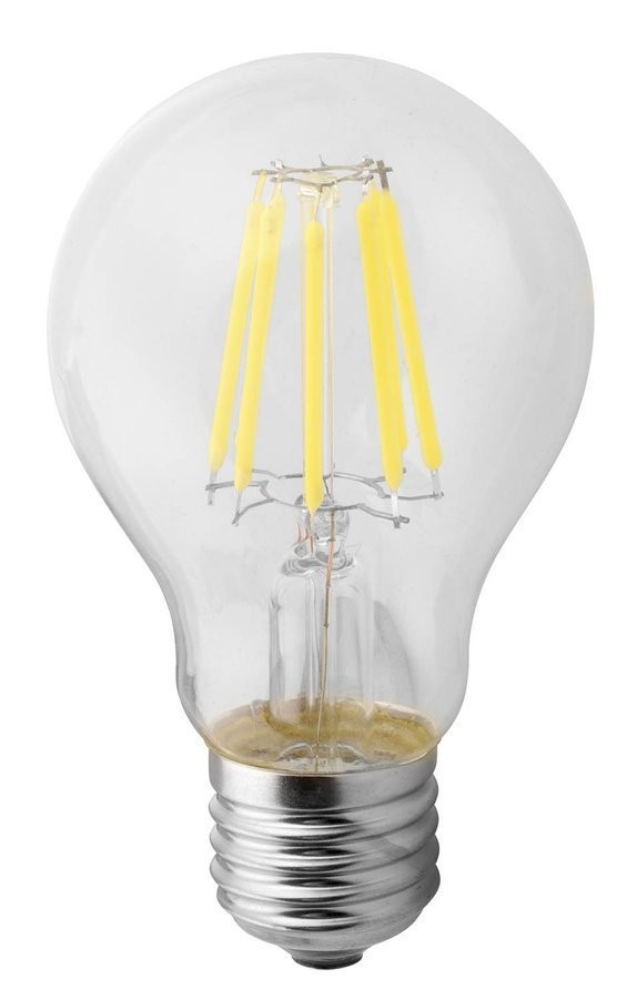 LED úsporná žárovka s vyzařovacím úhlem 360°, napětím 230V a závitem E27 nahradí 100W žárovku s wolframovým vláknem. Má spotřebu 8W a vzhledově je téměř k nerozeznání od klasické žárovky. Design žárovky tvořený skleněnou baňkou a nejmodernějšími COB LED Filament čipy ji předurčuje pro použití ve všech typech svítidel s paticí E27.