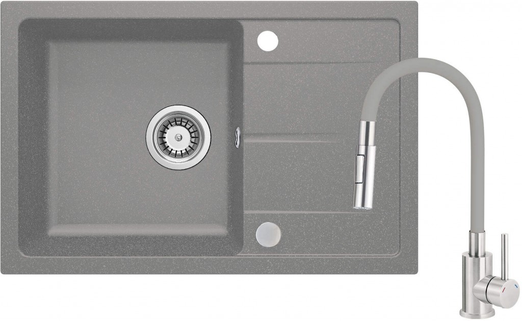 Žulový dřez s baterií tvoří kompletní kuchyňský set. Vyroben z odolné přírodní žuly, je odolný nejen vůči vysokým teplotám a výkyvům, ale také vůči nárazům a změně barvy, v souladu s evropskou normou PN-EN 13310. Je také obohacen o hydrofobní povlak, který usnadňuje odtok jednotlivých kapek. Zakřivený výtok baterie si zachovává svůj tvar, což umožňuje jeho nastavení v libovolném směru, což usnadňuje oplachování velkých a objemných předmětů, jako jsou plechy v troubě nebo police v lednici.