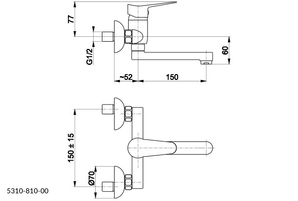 Nástěnná umyvadlová baterie LEONIT od výrobce KFA ARMATURA s roztečí 150 mm. Výhodou je otočné ramínko o délce 150 mm a keramická kartuš.