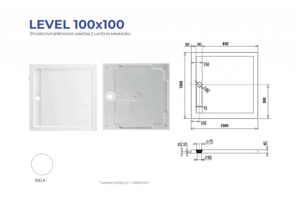 - plastový sifon LEVEL o průměru 60 mm součástí vaničky