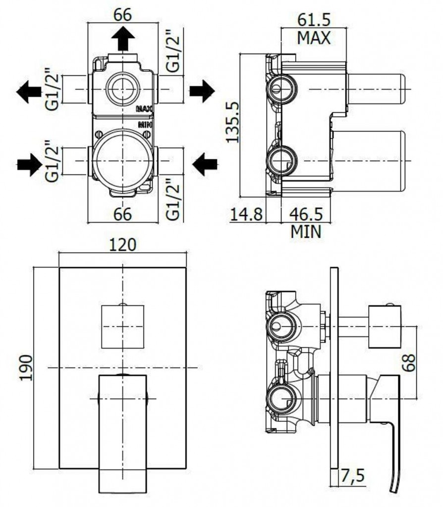 Páková baterie s otočným přepínačem včetně podomítkového tělesa