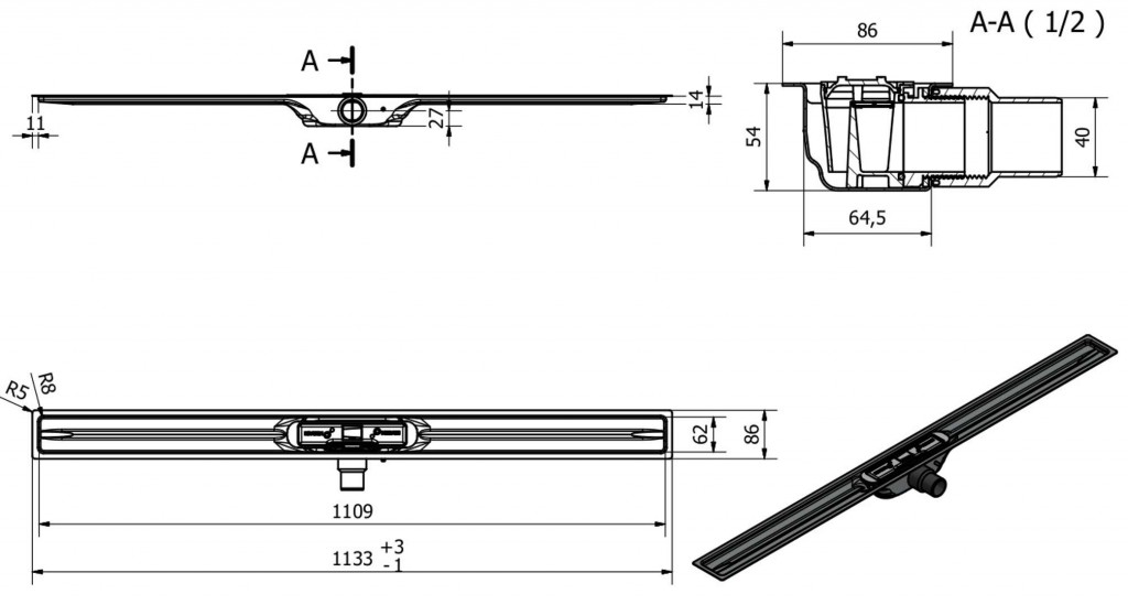 Sprchový žlab je vyroben z jednoho kusu nerezové oceli bez svarů, neobsahuje žádné spoje a lze tak velmi jednoduše čistit. Elegantně si poradí s vodou i ve Vašem bezbariérovém sprchovém koutu bez nutnosti montáže sprchové vaničky nebo hydroizolačního nátěru pod dlažbou.