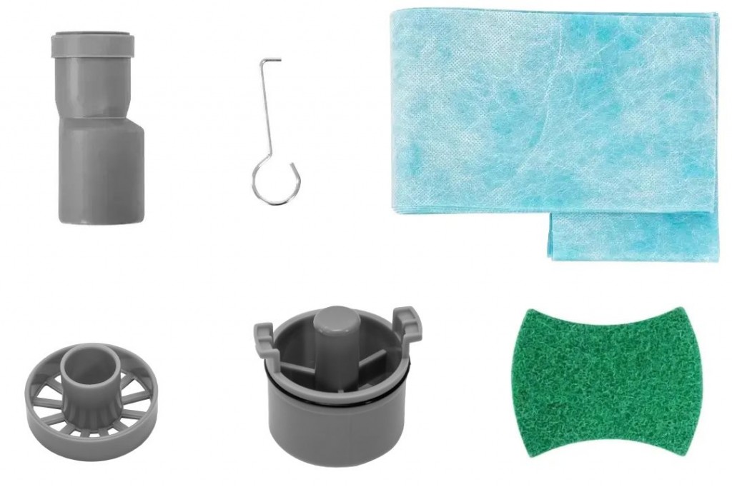 Sada obsahuje: nožičky, sifon, rošt, uživatelskou příručku a háček na výměnu masky.