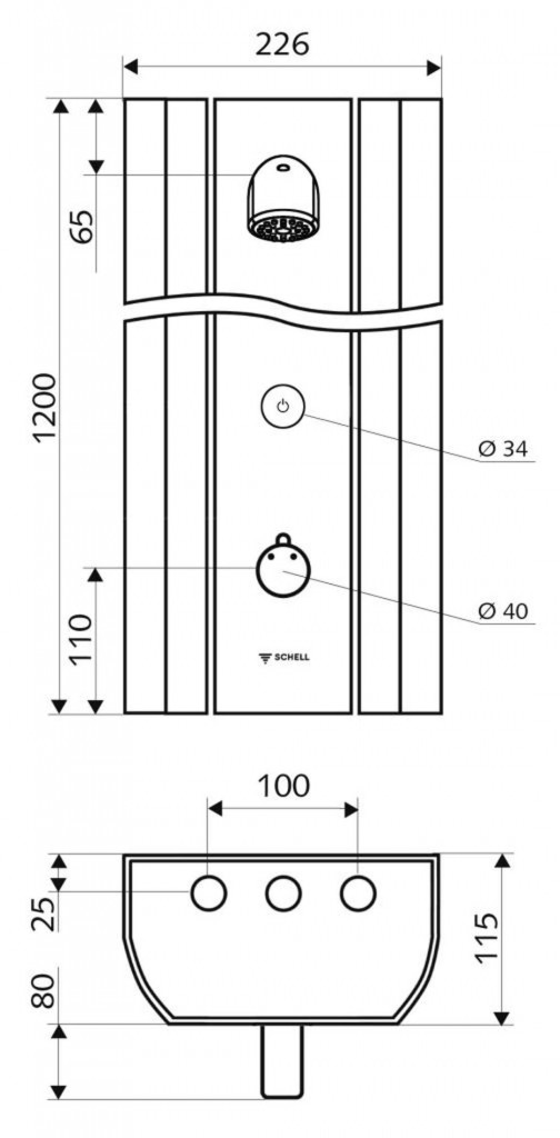 - Sprchový panel vyrobený z pevného extrudovaného hliníkového profilu s vysoce kvalitním eloxovaným povrchem a integrovaným sprchovým kováním SCHELL