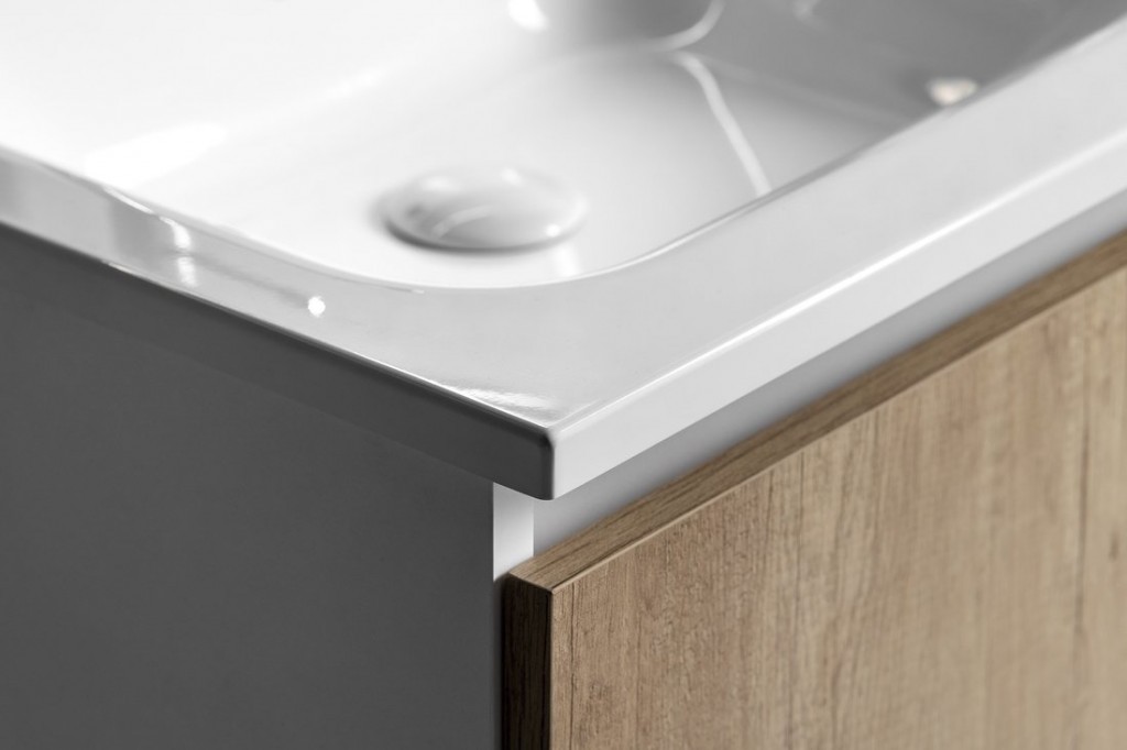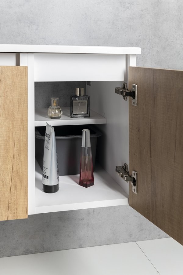 Uvnitř skříňky je nad zásuvkou praktická police na drobnosti každodenní potřeby. Pod hranu umyvadla lze instalovat tlumené LED osvětlení, které pro jeho nízkou spotřebu (1W) není nutné vypínat.