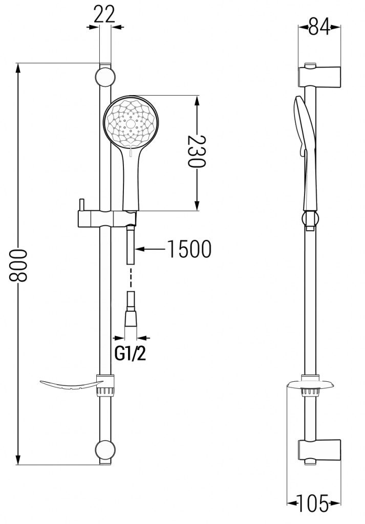 Rozměry držáku jsou: šiřka lišty 22 mm, výška 800 mm a hloubka od stěny je 105 mm.