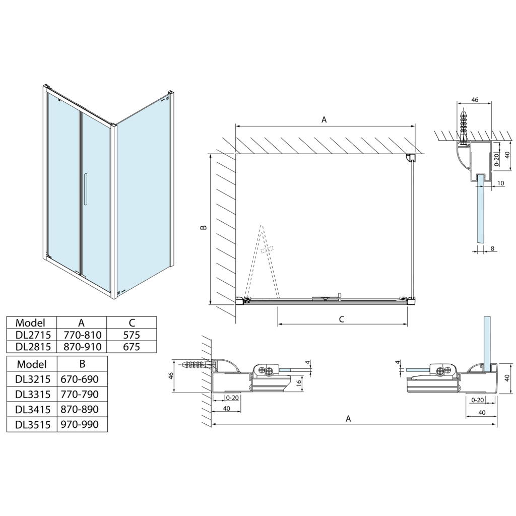 - Snadnou montáž umožňuje výsuvný stěnový profil v rozmezí 0-20 mm