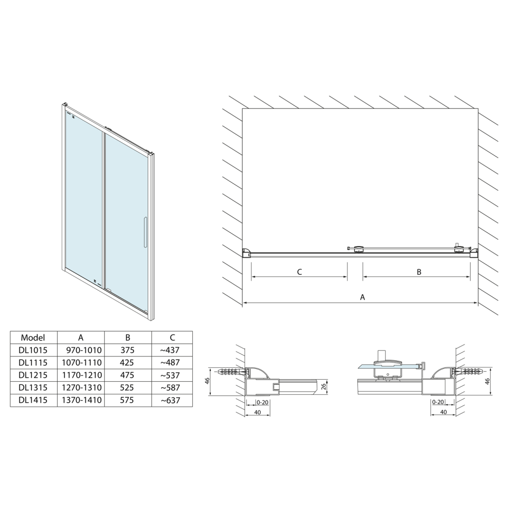 - Snadnou montáž umožňuje výsuvný stěnový profil v rozmezí 0-20 mm