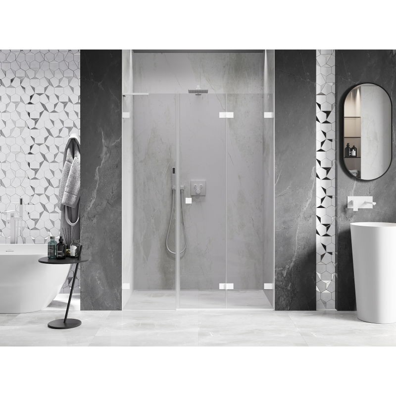 Specifikace produktu: Rozměr: 125x200 cm Strana montáže: Pravá Vchod: Skládací Barva skla: Průhledná Povrchová úprava: Bílá Profil: Hliník Stabilizátor ve tvaru L: Nerezová ocel Typ skla: Tvrzené Tloušťka skla: dveře 6 mm, stěna 8 mm Povlak pro snadné čištění Možnost nastavení šířky Dva montážní systémy: - S profilem, který umožňuje vyrovnání nerovností stěn - Bez profilu v případě dokonale rovných stěn Možnost montáže na sprchovou vaničku nebo obklady Mosazné svorky a panty v jedné rovině se skleněnou tabulí Magnetický proužek a elastomerové těsnění pro odvod vody Hliníkový práh těsnění dveří