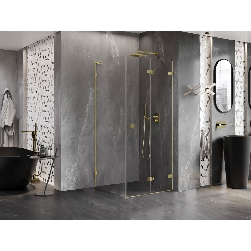 Specifikace produktu: Rozměr: 90x90 cm (pravé dveře 90 cm, stěna 90 cm) Výška: 200 cm Strana montáže: Pravá Vchod: Skládací dveře Barva skla: Průhledná Povrchová úprava: Zlatá Profil: Hliník Úhlový stabilizátor L: Nerezová ocel Typ skla: Tvrzené Tloušťka skla: dveře 6 mm, stěna 8 mm Povlak pro snadné čištění Možnost nastavení šířky Dva montážní systémy: - S profilem, který umožňuje vyrovnání nerovností stěn - Bez profilu v případě dokonale rovných stěn Možnost montáže na sprchovou vaničku nebo obklady Mosazné svorky a panty v jedné rovině se skleněnou tabulí Magnetický proužek a elastomerové těsnění pro odvod vody Hliníkový práh těsnění dveří